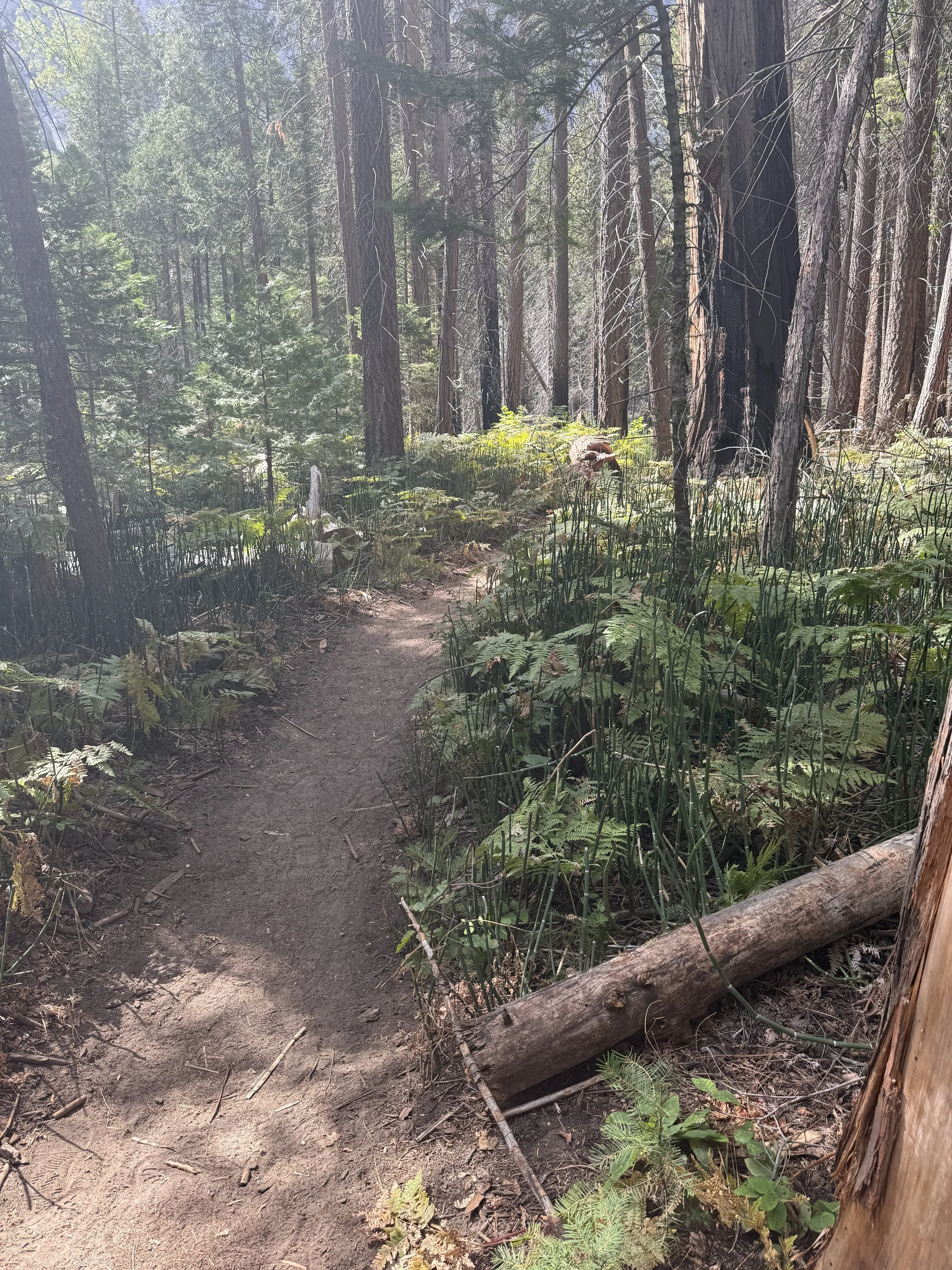 Mist Falls Trail: We hiked four miles along the King River to a very nice waterfall (watch the video clip below) and then four miles back. The terrain varied wildly. It started almost like a sandy beach because the granite was ground up so fine. Then, we entered a swamp area with lots of water plants followed by thick forests, granite domes and enormous granite fields where the boulders had broken off the granite domes that loomed over us. We even saw a rattlesnake curled up in the brush. Our trail also joined the historic John Muir Trail for a few miles. The JMT winds its way through the Sierra Nevadas along a 211 mile path. This trail had everything!