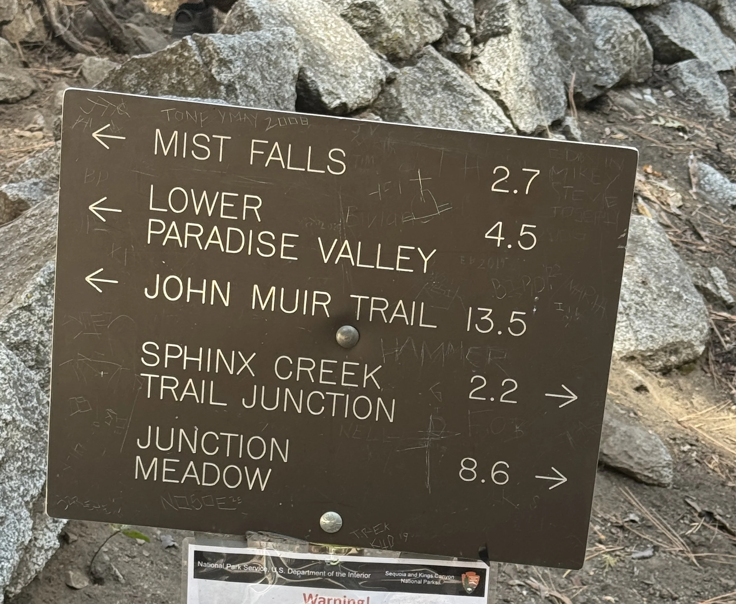 Our drive continued on the long trek down into the canyon. Kings Canyon was created by the King River, so it is more narrow than Yosemite Valley which was created by glaciers. The road into the canyon is another curvy, steep road with many switchbacks and eventually ends at a point aptly called “Roads End”. This point is the trailhead for several backcountry hikes. We met some folks back in Yosemite NP who had just come from Kings Canyon NP and they recommended that we hike the Mist Falls Trail once we got to this area. We took their recommendation and tackled the eight mile round trip hike. It turned out to be one of the highlights of our entire trip.