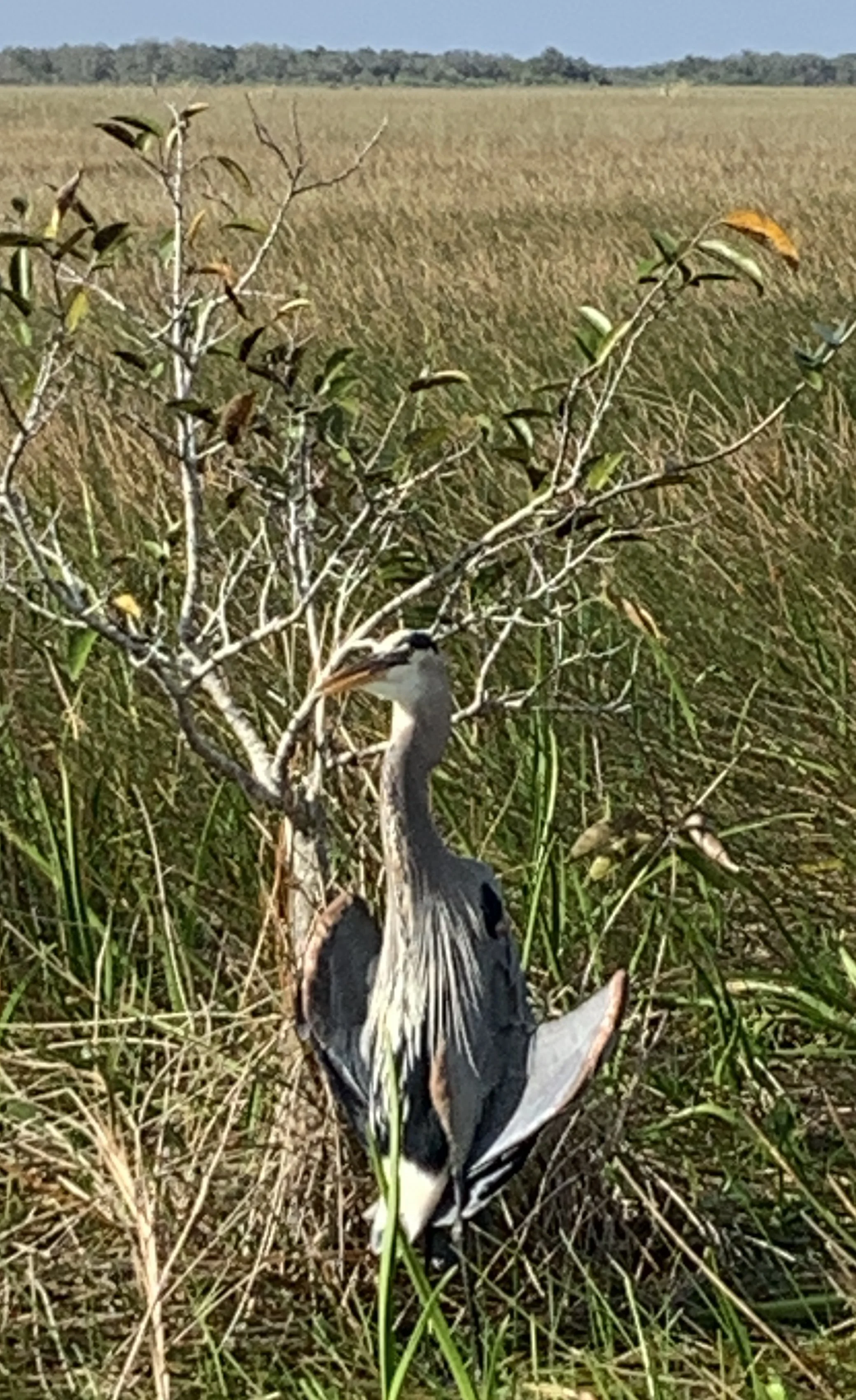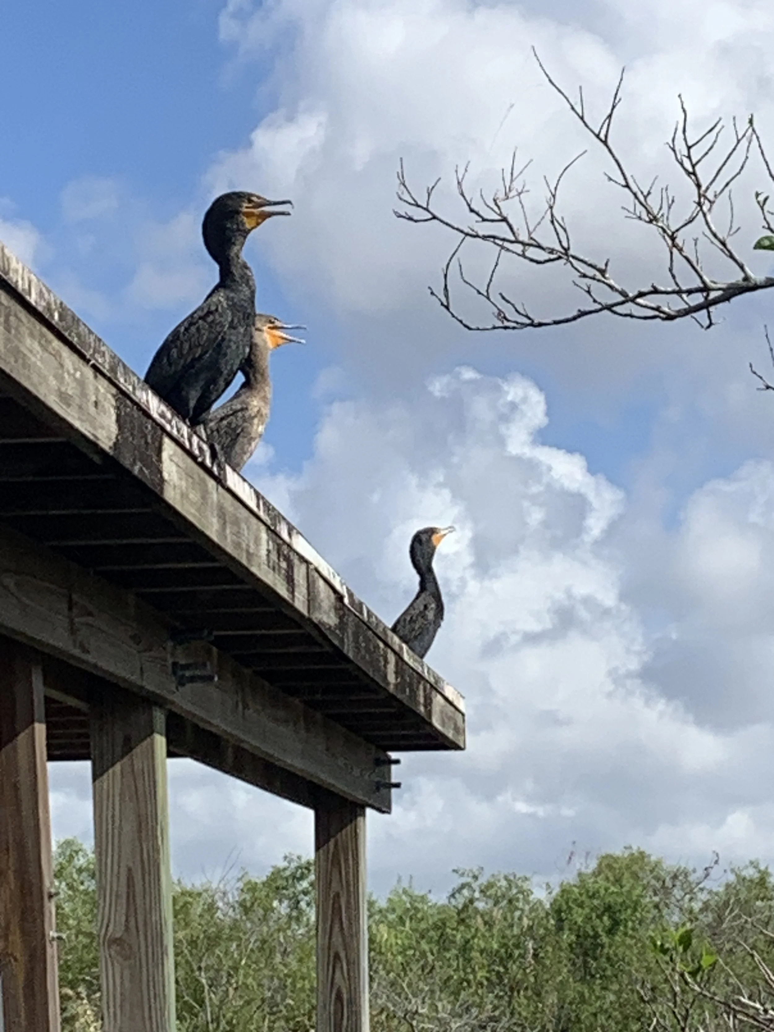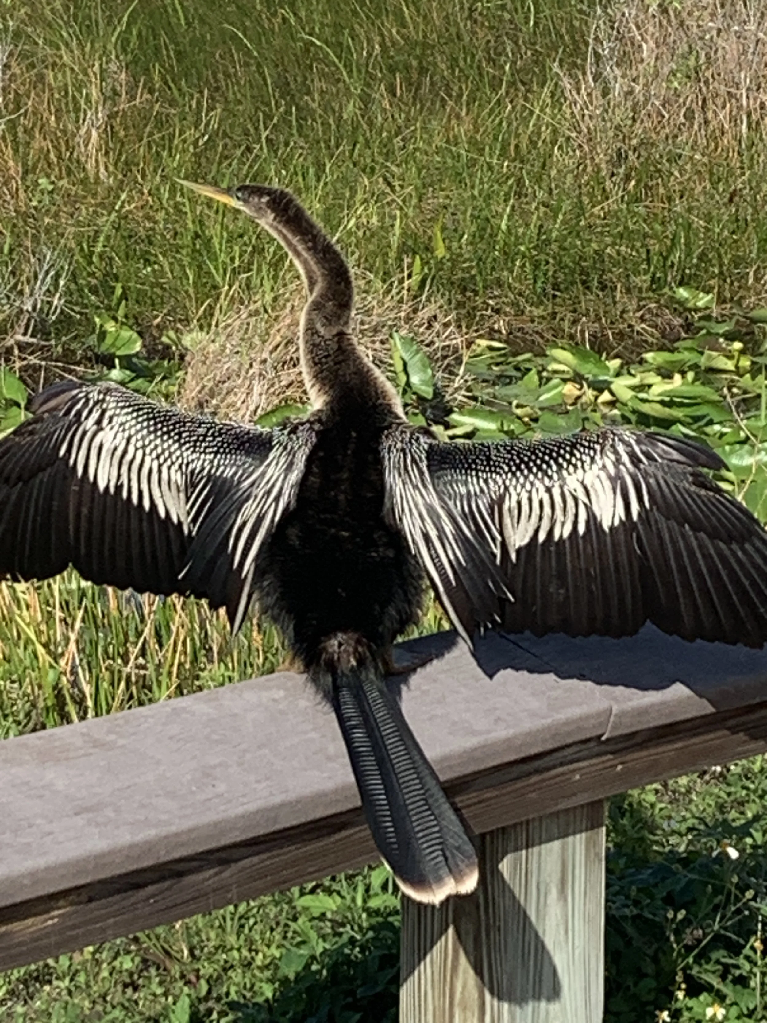 The trail was named after this bird species, Anhinga. This guy was showing off for everyone by spreading his wings while sitting on the boardwalk rail.