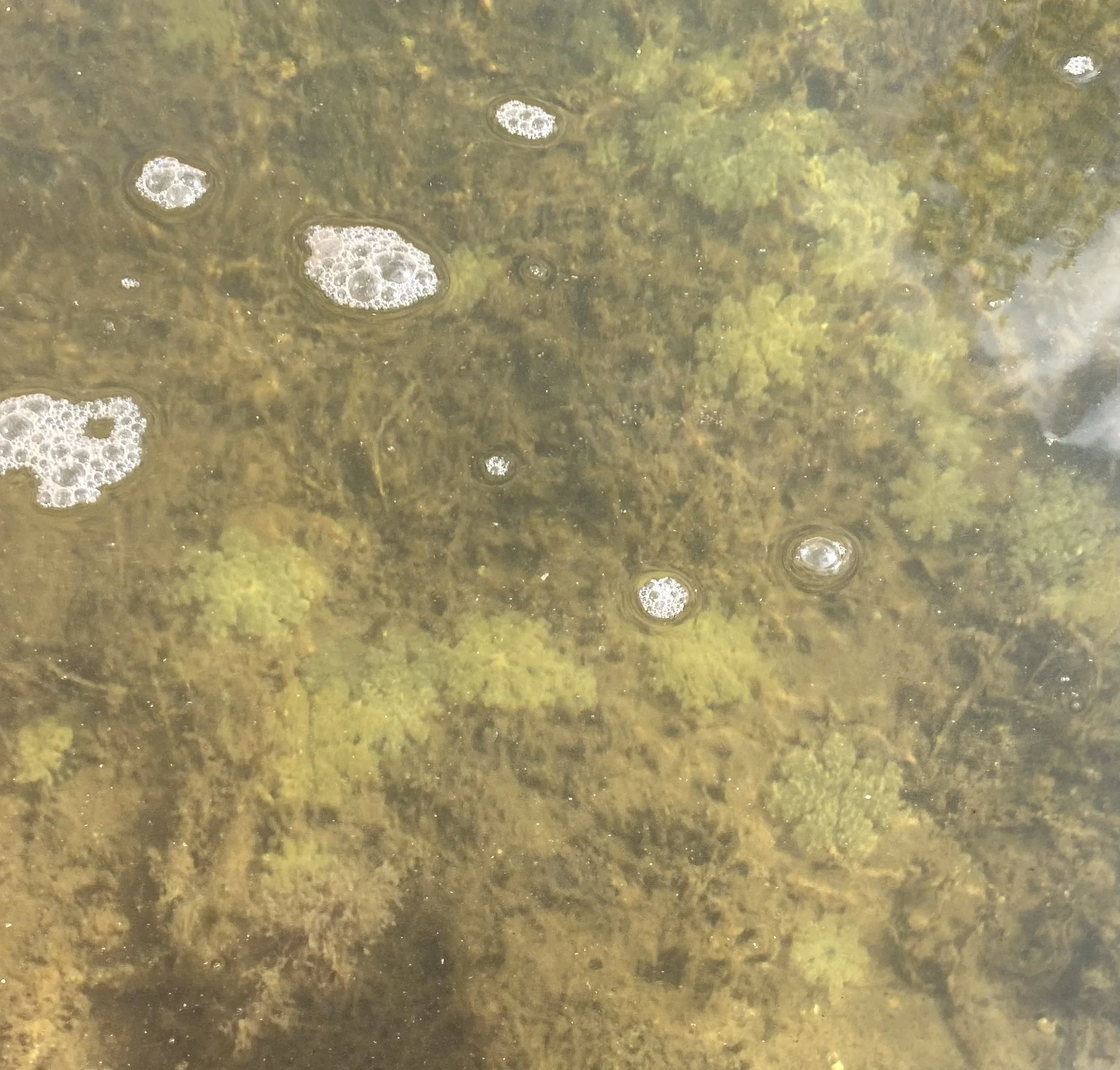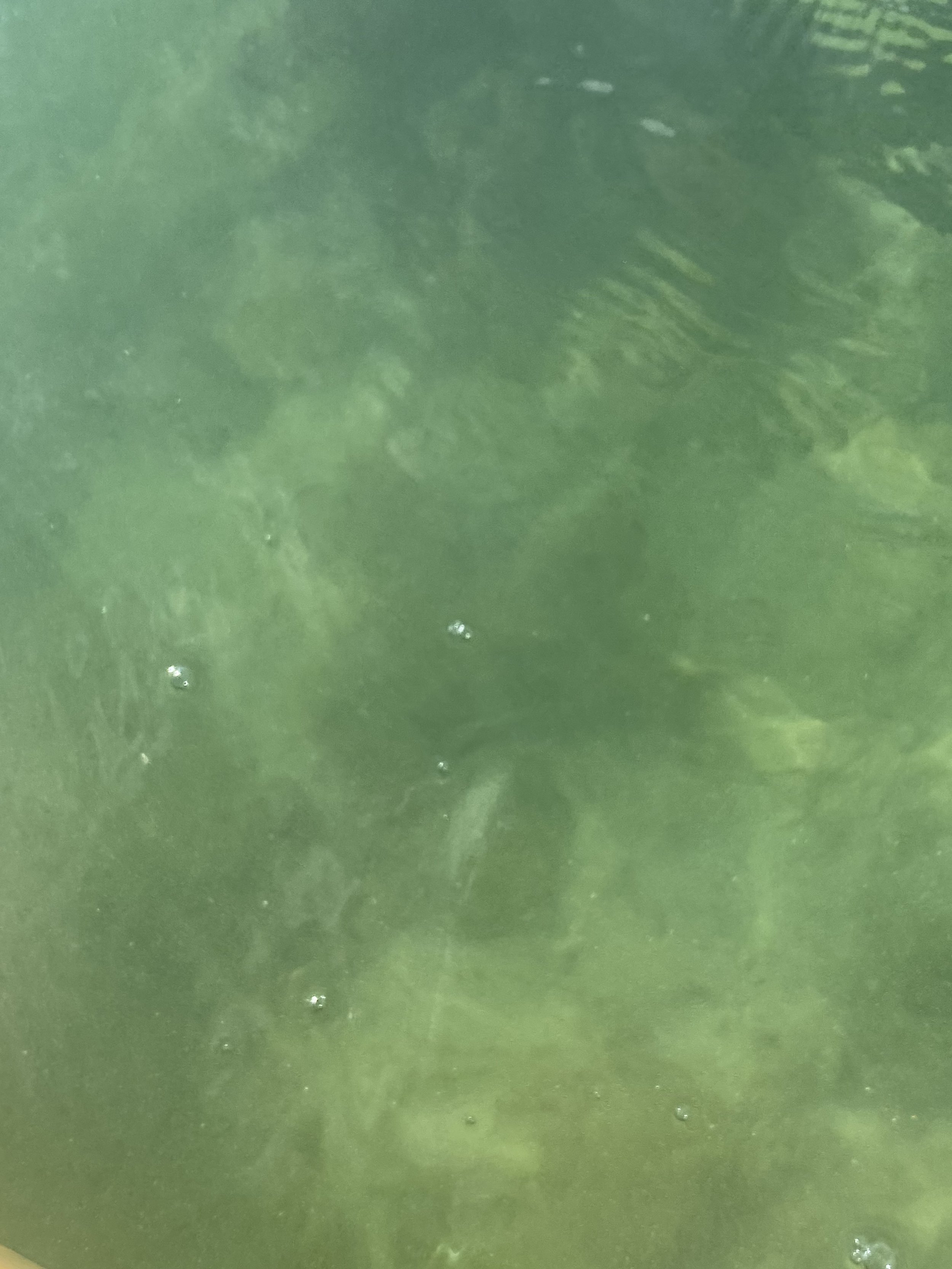 Below the water surface, you can see little white snowflake shapes. These are non-poisonous jellyfish called Cassiopeia. They are actually upside down and what you see are their tentacles which are attracting algae. There were hundreds of these beautiful jellyfish in shallow water