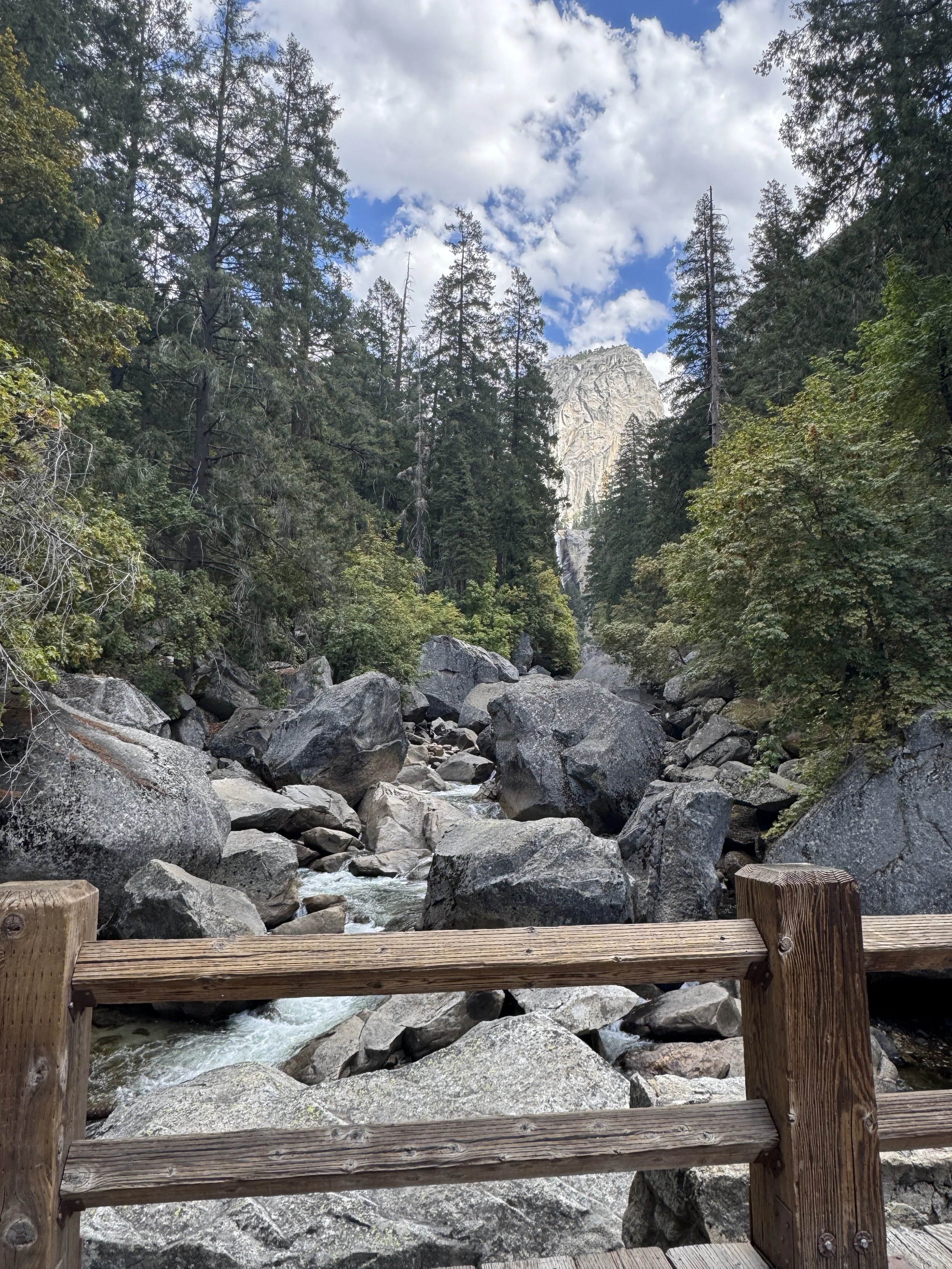 The Merced River runs through Yosemite Valley. This photo shows a tiny view of Vernal Falls with Half Dome in the background,