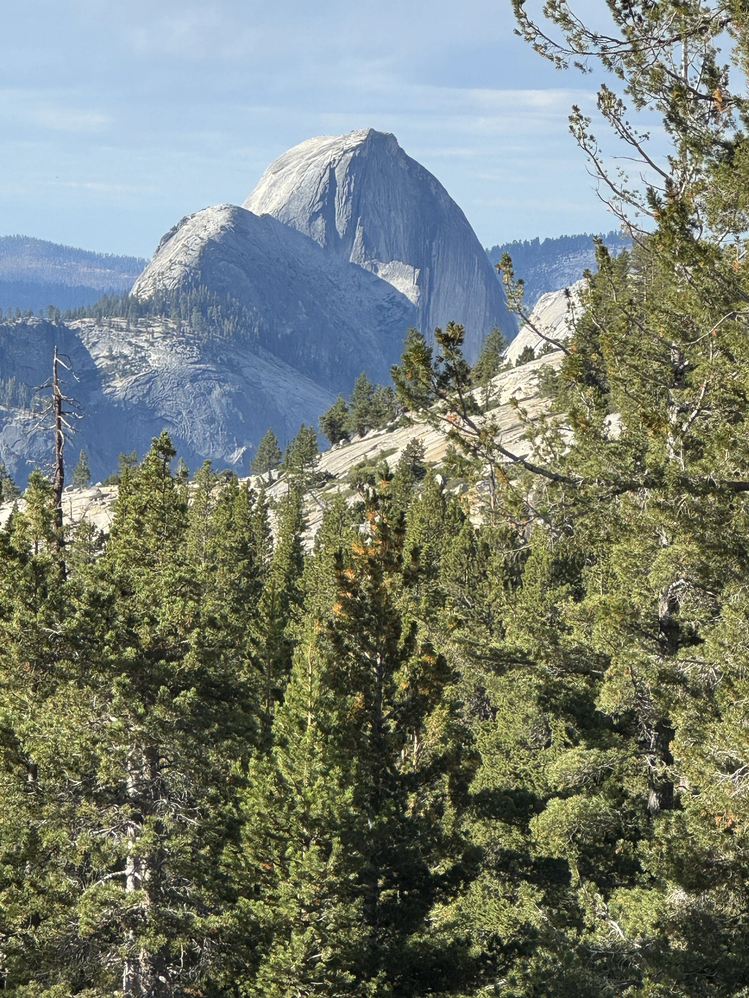 Half Dome is a famous landmark in Yosemite and can be viewed from many places. This was taken from Olmstead Point. Frederick Law Olmstead is the famed landscape architect credited with New York Central Park and advocate for public parks. Half Dome is a popular climbing/hiking 16 mile challenge that requires a special permit.